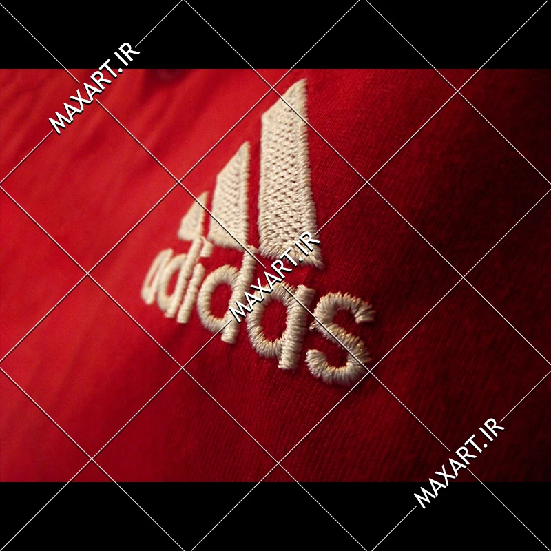 توضیحات عکس استوک تیشرت قرمز آدیداس – نمای کلوزآپ لوگو 2025