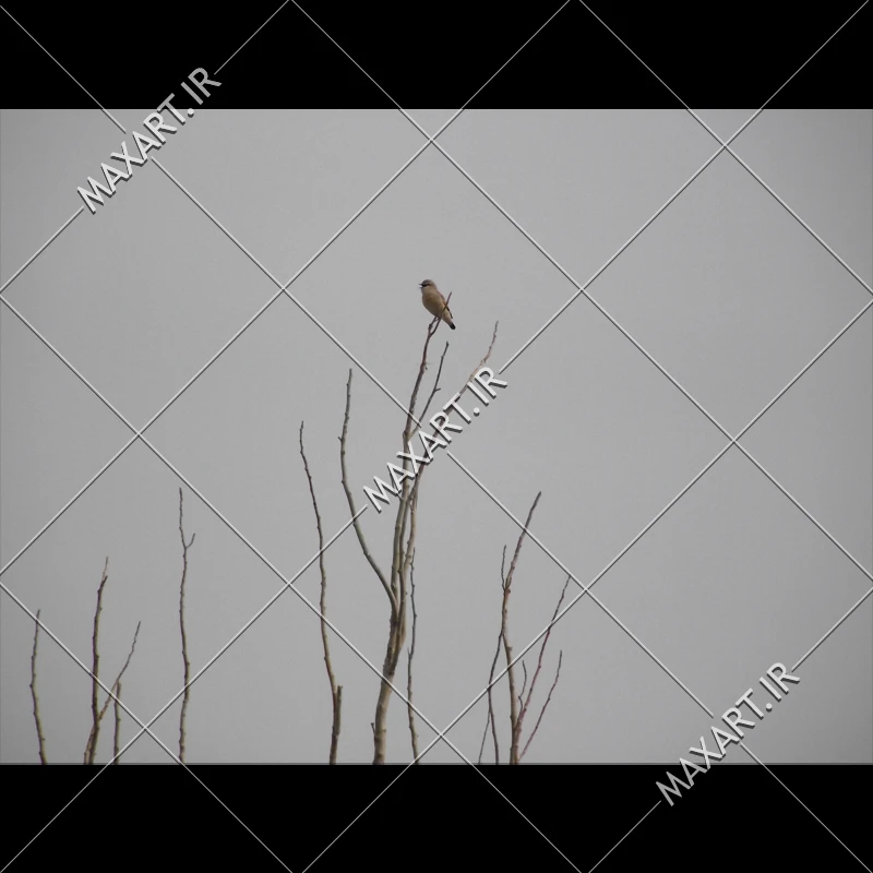 این تصویر با کیفیت بالا، نمایی مینیمال و تأثیرگذار از یک گنجشک تنها را نشان میدهد که بر فراز شاخههای خشک و باریک در مقابل آسمانی خاکستری و خنثی نشسته است. سادگی ترکیببندی، فاصله سوژه از پسزمینه و خطوط عمودی شاخهها، نگاه بیننده را مستقیماً به پرنده هدایت میکند.